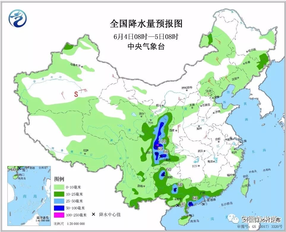 6月4日08时至5日08时,吉林东部、西北地区东南部、川西高原北部、西南地区东部、华南大部等地部分地区有中到大雨,其中,甘肃东南部、四川盆地中部、重庆西部、贵州西北部、广西北部、广东西南部等地部分地区有暴雨,局地大暴雨(100~110毫米)。内蒙古东部、辽宁西部、南疆盆地和新疆东部、甘肃河西、陕西、河北北部、河南东部等地部分地区有4~6级及以上风(见图5)。