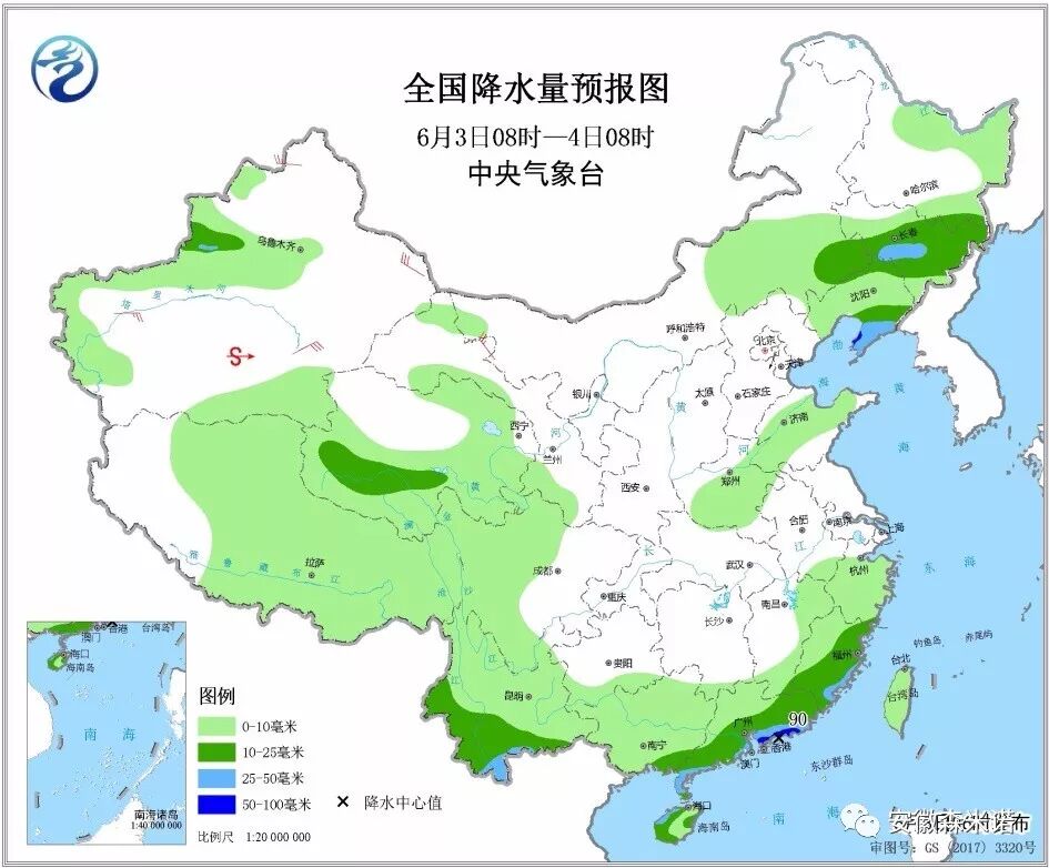 图4 全国降水量预报图(6月3日08时-4日08时)