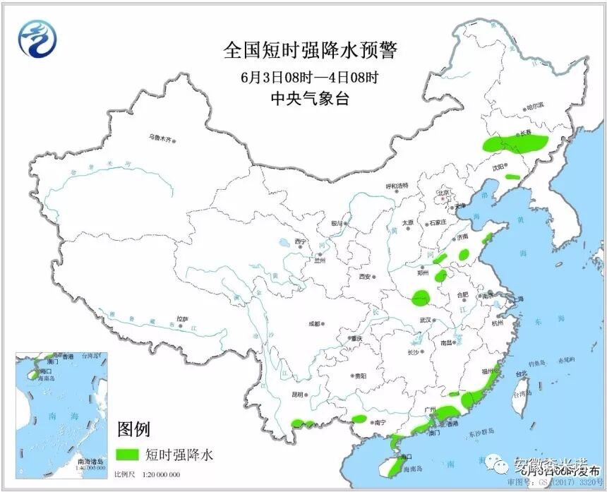 图3 全国短时强降水落区预报图(6月3日08时-4日08时)