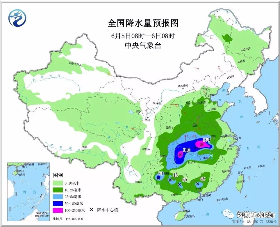 6月5日08时至6日08时,西北地区东南部、华北南部、黄淮大部、江淮西部、江汉、江南中北部、西南地区东部、华南北部等地部分地区有中到大雨,其中,河南南部、安徽西南部、江汉大部、湖南西北部、江西西北部、贵州中部等地部分地区有暴雨或大暴雨(100~160毫米)。内蒙古中东部、新疆东部、甘肃中南部、陕西北部、山西南部、河南南部、江汉东部等地部分地区有4~6级及以上风(见图6)。