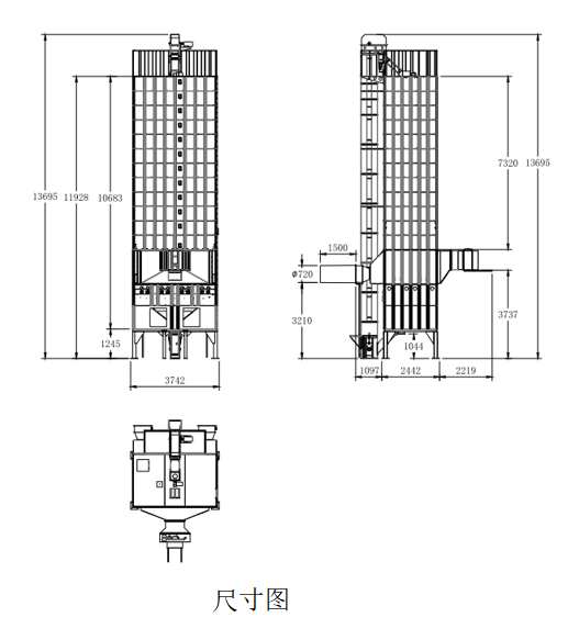 自动调风装置—大风机导风筒L=1.5米(含回风阀),每个项目点配一套烘干机自带爬梯。有自动调风装置,中部出料有放粮不锈钢管(L=6米)及钢丝软管(L=2米)、放料斗、上三通,底部下流管连接件,导风筒可加长0.5米。底部出料无放粮管、放料斗、钢丝软管、有顶部上流管连接件。